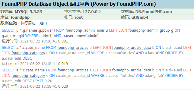 ### FoundPHP 数据分析 开发项目的时候我们对项目中分配的模块进行多人协作开发,这里常常遇到项目不稳定或效率低下的代码,这种情况下无从下手,FoundPHP提供了简单的数据库阅读工具,可以在项目页面页脚看到调试信息。  我们分析下可以看出这里使用了3条语句,分别是管理员信息、文章数据总量、文章数据分页 这样就可以得到了文章列表的功能。 我们在后台新页面一定会有管理员信息查询,其他都是开发时候查询的数据库,如果比较臃肿有10多条或20多的时候我们就可以进行优化。 开发不只是为了实现功能更是为了让更大负载的情况下达到最好的效果。